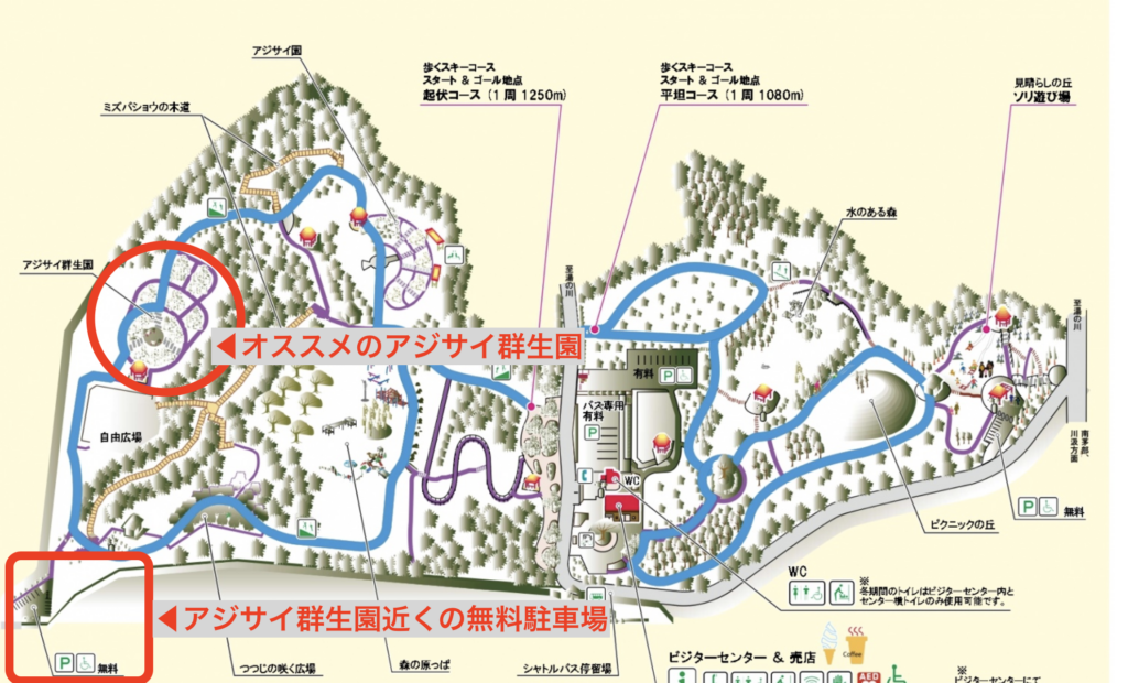 アジサイ群生園の名前と似ているアジサイ園というコーナーもあるのですが、アジサイ群生園の方が紫陽花の種類や数も多く、オススメです!